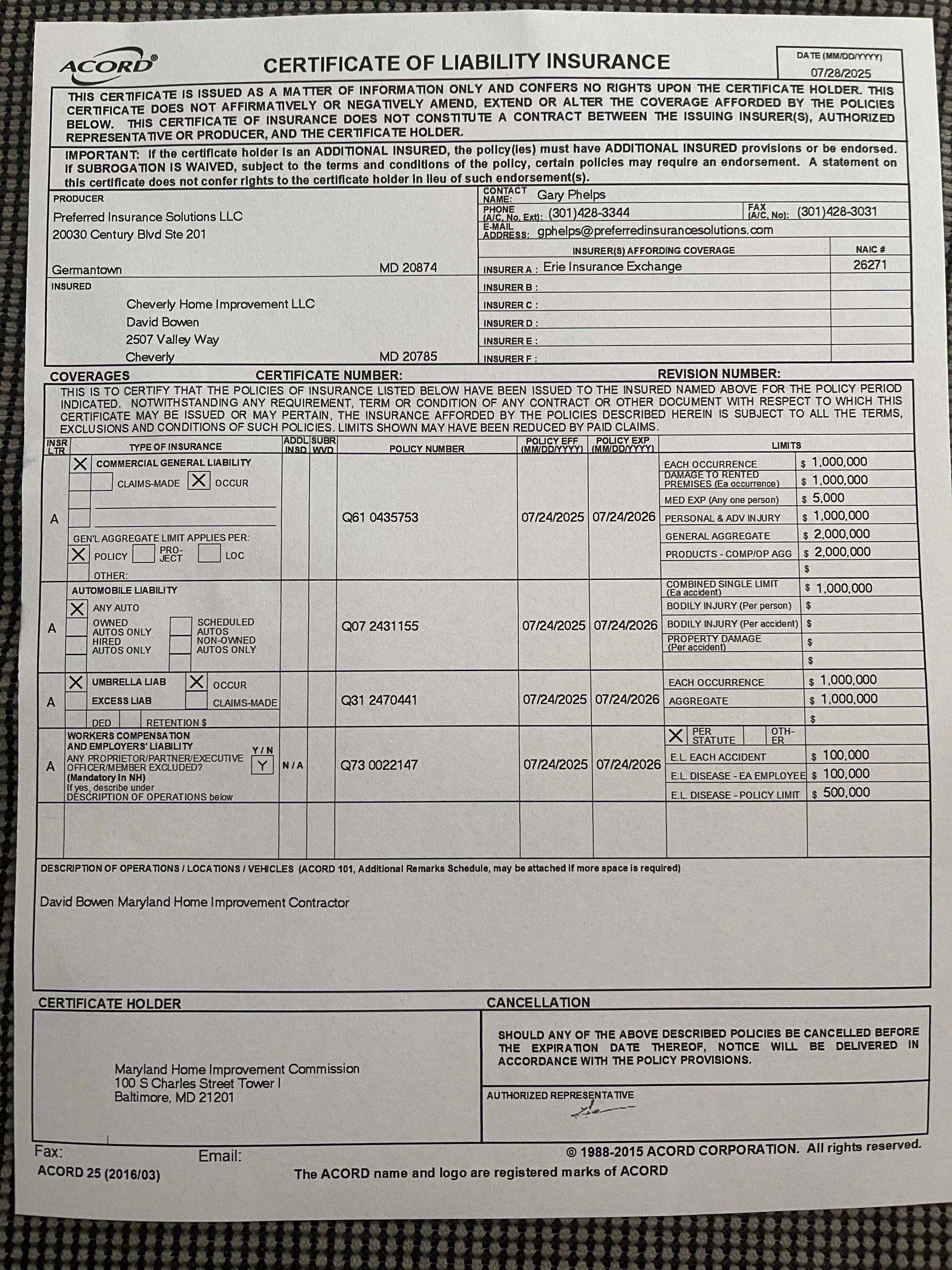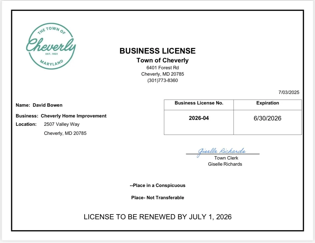 It all begins with an idea, but how do you know who to trust with your home? And how can you know a contractor is licensed? You ask for proof. Here at Cheverly Home Improvement, we provide it all upfront. Scroll down to see our up-to-date coverage and lead-safe certification. Even our communication person carries a Maryland contractor sales license. NOTE: The forms below are often needed for home improvement programs, insurance claims, and bank loans. The forms are provided below as a courtesy. We do not assist in any program applications.